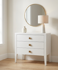 Elevate your bedroom or living room with the captivating Hara 3-drawer accent table/dresser. Crafted with meticulous attention to detail, this stunning piece is made from solid rubberwood and beech veneer, ensuring durability and timeless beauty. The brilliant white finish adds a touch of elegance to any space, while the brushed gold metal hardware pulls add just the right amount of sophistication.