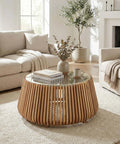 A masterpiece of design crafted from solid acacia wood with a glass tabletop that accentuates its stunning silhouette. This exquisite piece effortlessly stands out in any room, commanding attention with its unique blend of materials and impeccable craftsmanship.