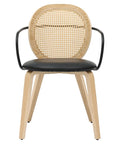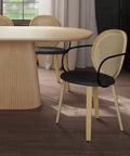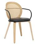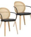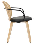 Bringing timeless elegance to the forefront with a modern twist. The faux rattan on the chair back creates a soft and inviting look while the black metal wrap-around arms and black faux leather seat give a more updated look to these chairs. The light oak finish of the bentwood frame and legs is the perfect finishing touch to tie it all together. Great for formal or casual dining spaces.