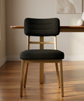 The Phoebe Versailles Dining Chair with Gold Legs blends modern simplicity with a touch of upscale style. The deep black upholstery offers a sleek, sophisticated look, while the warm gold metal frame adds a soft elegance that instantly elevates any dining space. Designed for comfort and everyday durability, the cushioned seat and gently curved backrest provide supportive seating for meals, gatherings, and everything in between. Versatile, stylish, and easy to pair with a range of décor, this chair brings a polished, contemporary feel to any home.
