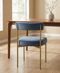 Exude modern style with this open back dining chair. Stocked in velvet slate fabric with an antique brass steel frame.