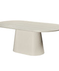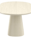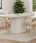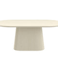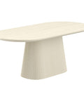 Elevate your dining experience with this oval pedestal base dining table, a hallmark of high-end designer inspiration. Featuring a beautifully reeded wood base, this table exudes timeless charm, offering a refined focal point for any dining space. The bevelled table top and the visible wood grain throughout add natural beauty and organic texture.