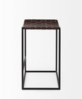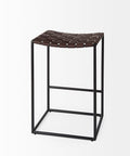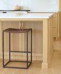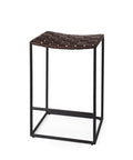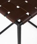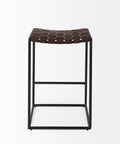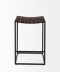 Clarissa is a High Brown Woven Counter Stool and measures 18.0" long by 16.0" wide by 26.0" high. The Clarissa is finished with solid black iron legs and a brown leather seat in a woven formation. The Clarissa is a versatile counter stool, with a simple design that allows you to add functional seating space that is stylish and unique. Designed to complement industrial styled spaces, the Clarissa counter stool blends seamlessly into spaces where clean lines and dark accent pieces are present.
