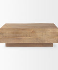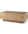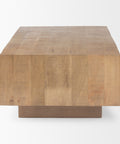 This solid, light brown rectangular coffee table adds organic depth to a space with its natural, distressed texture and soft finish. The rustic, minimalist design of the Hayden series has a large impact; a solid, box-like top sits on a recessed base giving the illusion that it is "floating" in the room.