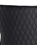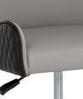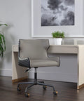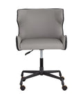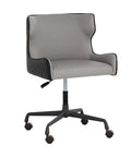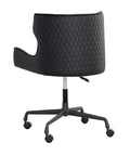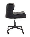 A classic office chair featuring a substantial seat upholstered in contrasting dillon stratus and black faux leather. Diamond stitching on the seatback adds a hint of elegance while a black powder-coated metal base completes the look.
