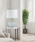Your search for the perfect table lamp to feature in your transitional design project ends here. This one expertly combines pale blue glass, chrome details and a crisp white linen shade to create a lamp with classic good looks. Anywhere you place it, beautiful light and style are guaranteed.