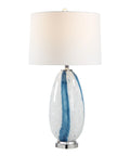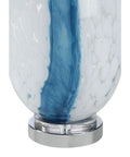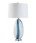 This classic table lamp has what it takes to elevate any space with a charming touch. Crafted from blue and clear glass with chrome details, its body captures light with an eye-catching sparkle while its white linen drum shade diffuses light with a soft glow. Perfect for placing on a side table or console or credenza.