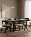 This dining table balances clean, geometric lines with rich wood texture. A checkerboard-patterned top and solid wood legs make it a sculptural yet practical centerpiece.