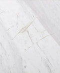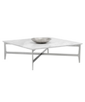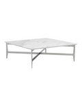 Chic and elegant, this spectacular coffee table features a brushed stainless steel base with a beveled white marble layer top. Each piece is uniquely marked with grey veining. As marble is a natural material, unique veining, pitting, fissures, micro-cracks and colour variations are all characteristics that add to the uniqueness and beauty of each piece.