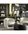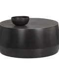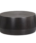 A large, captivating coffee table with an alluring bronzed gunmetal finish. Features a hand-etched and hand-hammered top with a drum style base. This piece will add a contemporary flair to living, lounge and office spaces