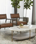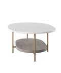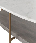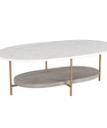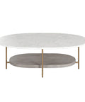 Combining a rich mix of materials, this oval coffee table is inspired by mid-century designs. Features a white Banswara marble tabletop and a grey acacia wood shelf. Completed with an antique brass iron frame.