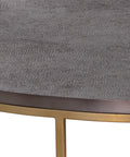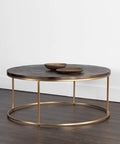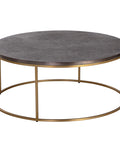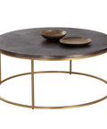 A round coffee table that takes influence from global travels. Features a bronzed gunmetal aluminum tabletop with a textured finish on the top. Completed with a brass stainless steel frame.