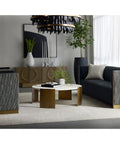 Modern design meets mixed materials in the Gallus Coffee Table. The cream coloured glass fibre-reinforced concrete table top has a soft slate effect to give the piece an added texture. Curved powder-coated steel legs in an antique brass finish give an added contrast that ties the look together. Rubber felt protectors included.