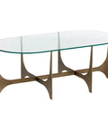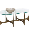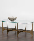 With a captivating sculpted base, this contemporary coffee table will effortlessly elevate any space. Features a 10mm clear tempered glass top and completed with a powder-coated steel base in an antique brass finish