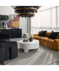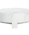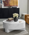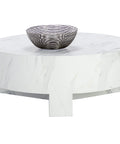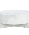Infuse modern simplicity into any space with this alluring coffee table. Features a circular tabletop with a cutout base. Crafted from sealed concrete with a white Calacatta marble finish and its signature warm veining. This marble finish can have unique veining, pitting, fissures, micro-cracks and colour variations that add to the uniqueness and beauty of each piece.
