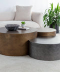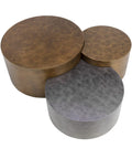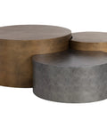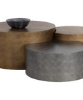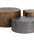 Add ultra contemporary appeal to various spaces with the stunning Neo Coffee Tables. Comprised of three metal pieces designed to fit together at staggered heights and in varying antique brass and nickel finishes. Each table top has a handmade swirl pattern that is unique to each piece and will vary. Function and dimension at its finest. All three pieces sold as a set.