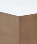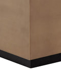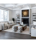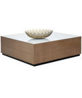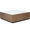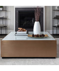 This large, stylish coffee table is elegant and modern. The unique white glass top is framed with a stunning brushed gold stainless steel frame and black oak wood base. Suitable for commercial and residential environments.