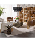 The Tarsus Coffee Table exudes industrial chic with its metal look and sculpted design. Crafted from glass fibre-reinforced concrete with an antique bronze finish. A striking piece from all angles, this table features open arches at the bottom. Rubber felt protectors included.