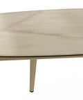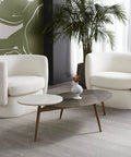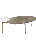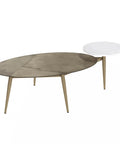 A unique coffee table crafted with mixed materials and organic shapes. Features a hand-etched antique brass iron oval top and legs with a round white marble shelf.