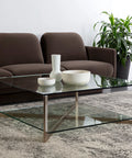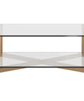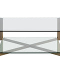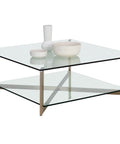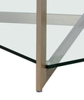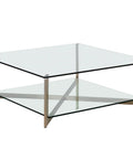 A sleek and modern square coffee table. Made with a tempered glass top and bottom shelf perfect for displaying decor and accents. Finished with an antique brass stainless steel frame.